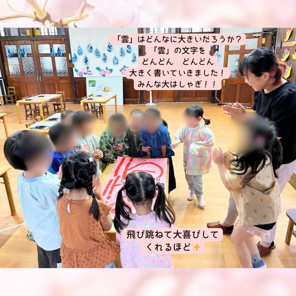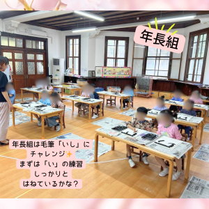年中さんは、基本的な筆づかいよりも筆に慣れることや書く楽しさを味わうことを優先して活動しています。
