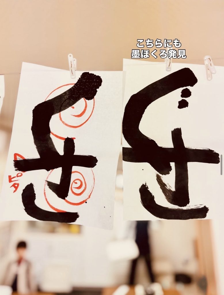 筆に含ませる墨の量がまだつかめないうちは、ポタポタと半紙に落ちてしまうことがあります🖌️